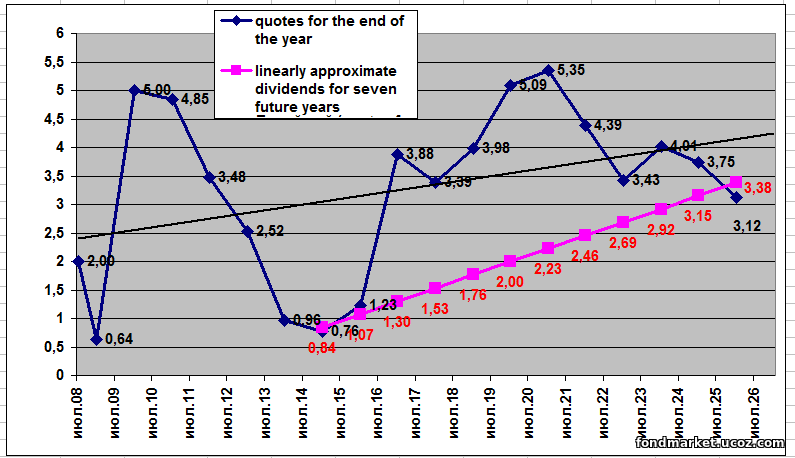 Linearly approximate dividends for seven future years and quotes for the end of the year are on the figure.